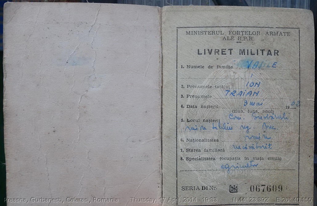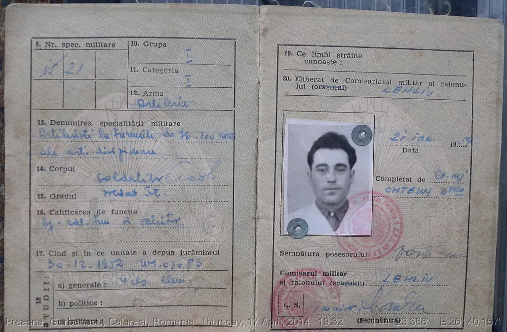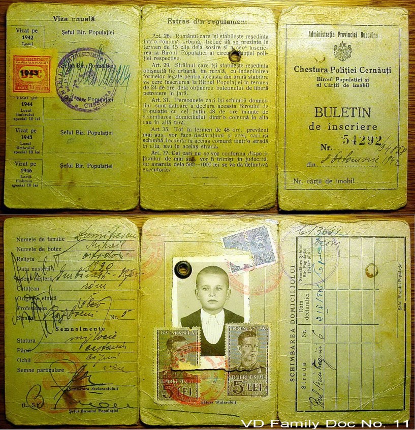Cartea de identitate a elevului Dumitrescu Mihail din Gurbăneşti, emisă de Chestura Poliţiei din Cernăuţi în anul 1942, pe când acesta urma cursurile Liceului Economic aflat în oraşul din Bucovina de nord. -